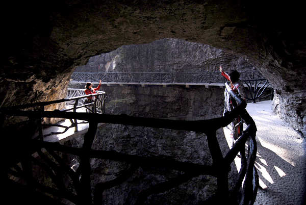 據(jù)施工人員介紹,此條棧道也是他們所修棧道中施工最難,最險(xiǎn)峻的一條.如果您還覺得不夠刺激的話,在棧道的完結(jié)處的兩個(gè)懸崖之間有一條長160米的懸索吊橋,同時(shí),在海拔最高點(diǎn)還有一個(gè)挑戰(zhàn)心里極限的玻璃站臺(tái),在這里,如果你能挺直腰板伸開雙臂,那么,您就是真正的勇士了.