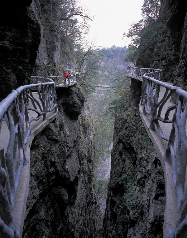 鬼谷棧道,位于覓仙奇境景區(qū),因懸于鬼谷洞上側(cè)的峭壁沿線而得名.