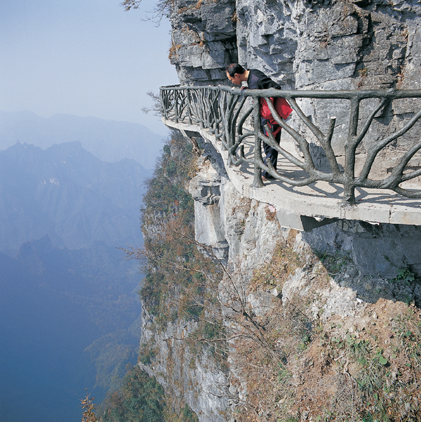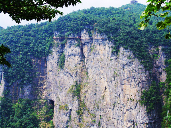 站在棧道上俯瞰群山,古人“會(huì)當(dāng)凌絕頂,一覽眾山小”的感覺油然而生.由于天門山是國家森林公園,植被特別豐富,加上典型的喀斯特地貌,所以,在這條棧道上更能找到一種在乘坐直升飛機(jī)飛越熱帶雨林大峽谷的感覺,這平時(shí)只能在電影里看到的場景,在這里能讓你身臨其境.
