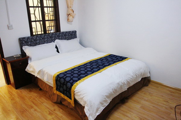 對了,驢友大廳還準備了臺電視,晚上大家可一起欣賞節(jié)目,今年的足球世界杯可一起為喜歡的球隊邊喝彩邊喝酒,還準備了幾張小木桌子及若干小木椅子,白天可以搬在屋外院子中邊曬太陽邊喝茶聊天或打牌,晚上可邊欣賞星星邊吃西瓜。    房間內(nèi)除了床上用品是準四星標準配置外,床尾單是按土家印花布定制的,有民俗特色,電視、獨立衛(wèi)生間、飲水機等齊全,1.2米的床,淡黃色溫馨墻紙配杉木地板,墻上配原木相框及土家印花或銀飾配件,還在床頭柜上留個小小的厚厚的本子,記錄一路下來住在這個房間自助游客的故事。     房間的命名,除了用數(shù)字命名外,也配以景點名字,如,101號房也叫跳魚潭,102號房也叫紫草潭,103號房叫雙龜探溪等等,相應(yīng)房間內(nèi)掛上一副其景點的美圖,一樓上二樓那片大大的墻,為照片墻,游客的照片,我們的照片,旅館的照片,圍繞的整片墻,過道上及兩側(cè),掛上長長的大紅燈籠,掌柜的每天和來自各地不同的游客們交流,傳授他們張家界和鳳凰自助游的獨門秘籍,晚上一起吃吃喝喝,說說笑笑。