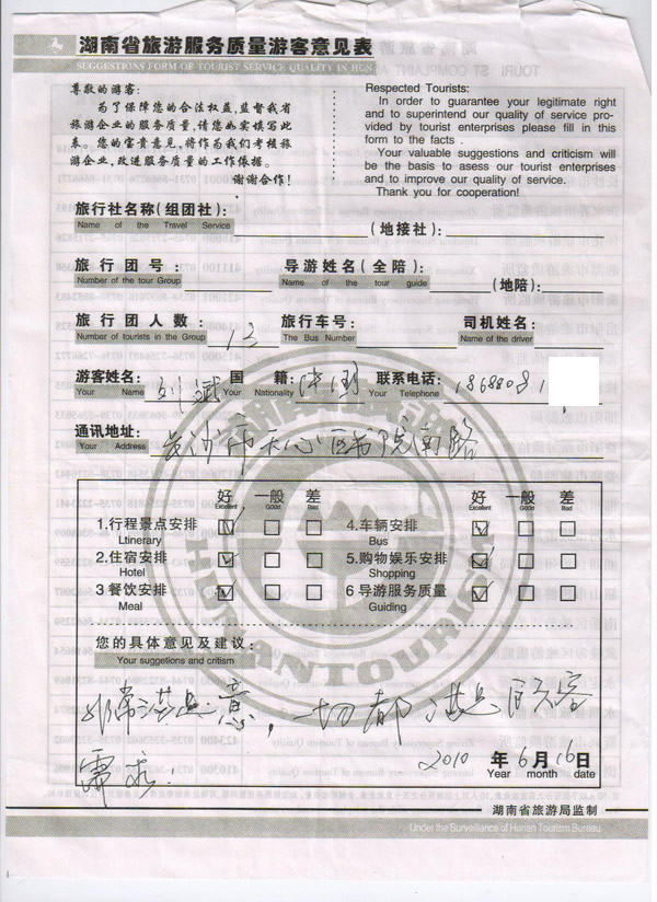 長沙劉斌一行13人旅游質(zhì)量回饋