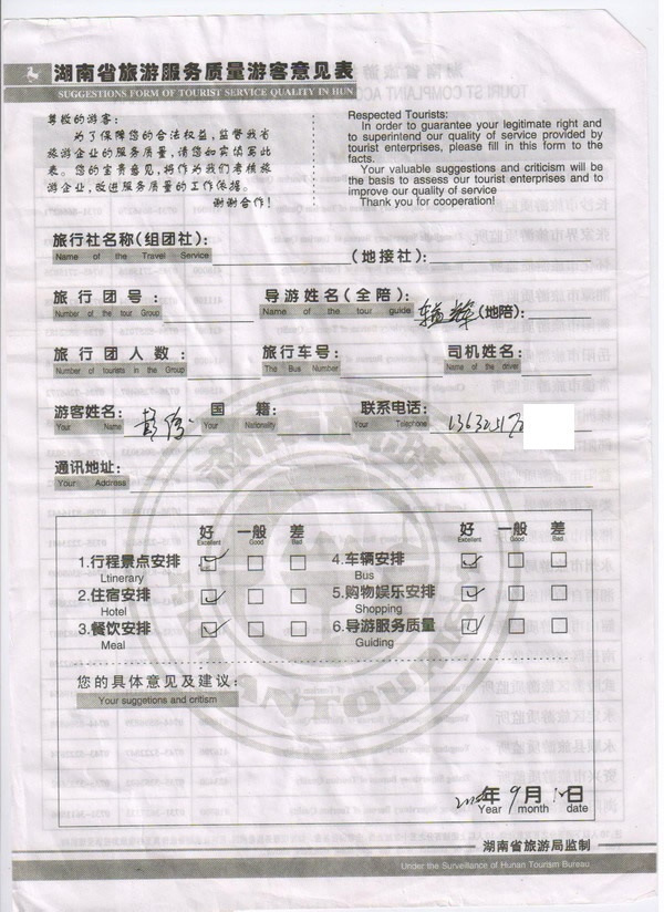 深圳彭俊一行6人旅游質(zhì)量回饋