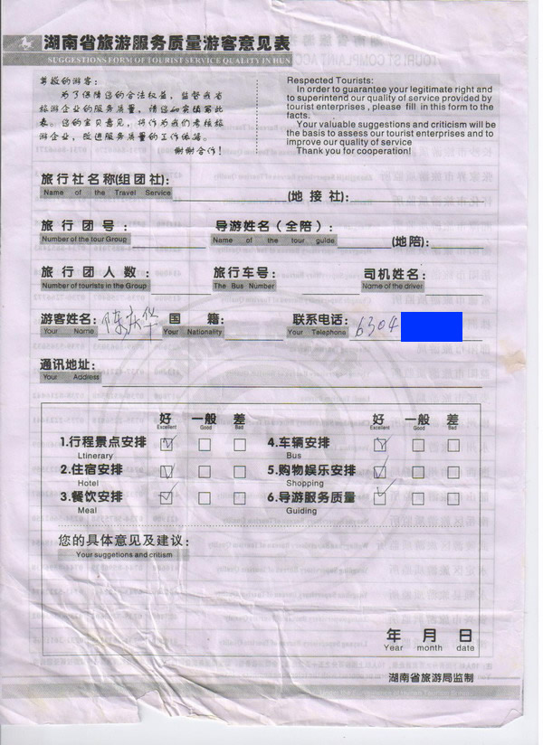香港陳先生一行6人旅游質(zhì)量回饋: