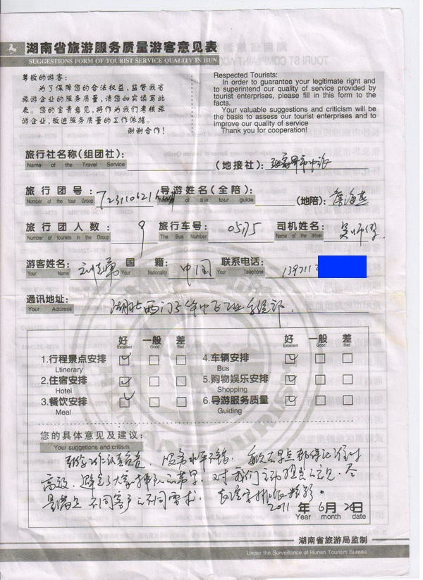 湖北劉先生一行9人旅游質(zhì)量回饋: