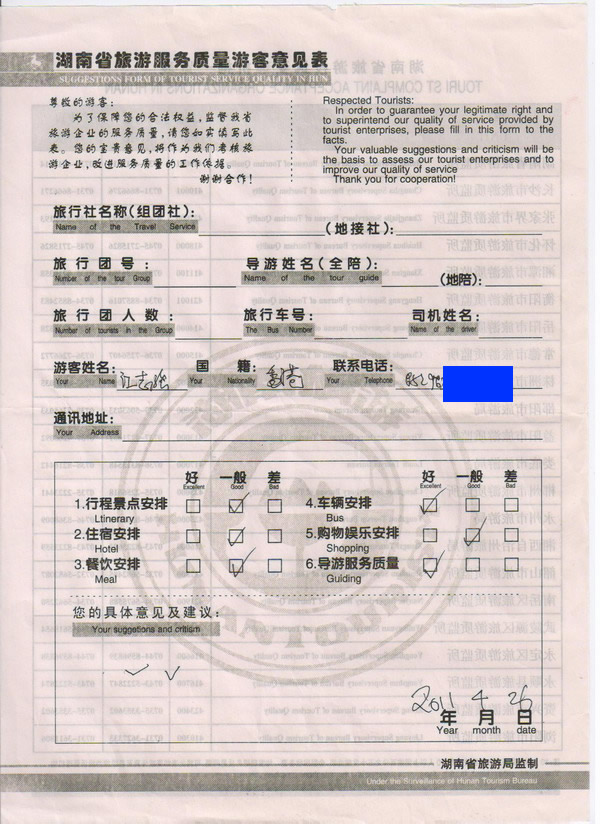 香港江先生一行8人旅游質(zhì)量回饋
