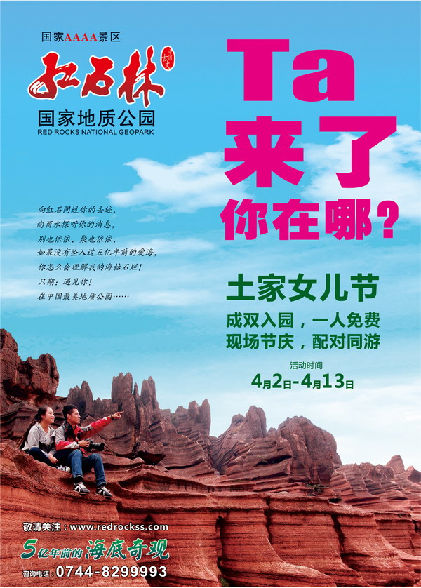 如果你是戀愛人士或已婚,那么恭喜你,將在4月2日—13日期間享受“情侶一票”或“家庭免一票”的優(yōu)惠,和你心愛的他(她)來一場“踩腳定親”吧。別吝嗇你的愛,“秀愛有獎”環(huán)節(jié)還將見證你們在紅石林那“?菔癄情亦堅”的不渝愛情。