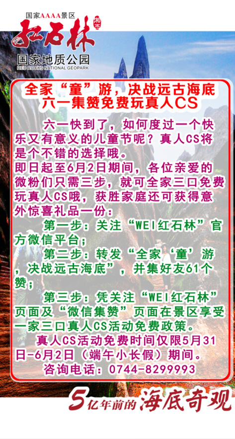 第三步:憑關(guān)注“WEI紅石林”頁(yè)面及“微信集贊”頁(yè)面在景區(qū)享受一家三口真人CS活動(dòng)免費(fèi)政策。