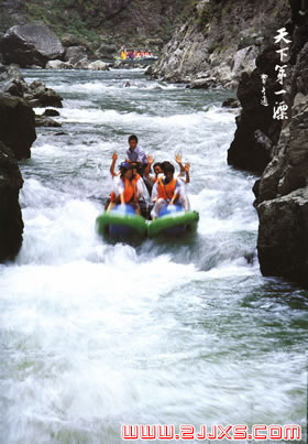 天下第一漂從離王村古鎮(zhèn)十多公里的一個(gè)叫哈妮宮的地方開(kāi)始,那逼人的綠色,啁啾的鳥(niǎo)音,空靈的水聲便和著峽谷野風(fēng)撲面而來(lái),浸淫你每一寸肌膚。陽(yáng)光順著長(zhǎng)滿戟形葉片的古藤溜下來(lái),猛不丁地被突兀的崖石擊了一掌,扭曲著篩過(guò)蓊郁的枝葉,如一枚枚古幣般在綠得有些發(fā)藍(lán)的河上跳躍,閃著古老的光澤。沙灘、卵石、艾嵩、蒲草、漁歌和野性十足的流水,都在以最簡(jiǎn)單最直接的方式提醒你;上橡皮舟吧,去漂向神秘,漂向思緒的觸角還沒(méi)有過(guò)到的地方。