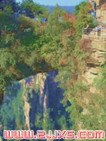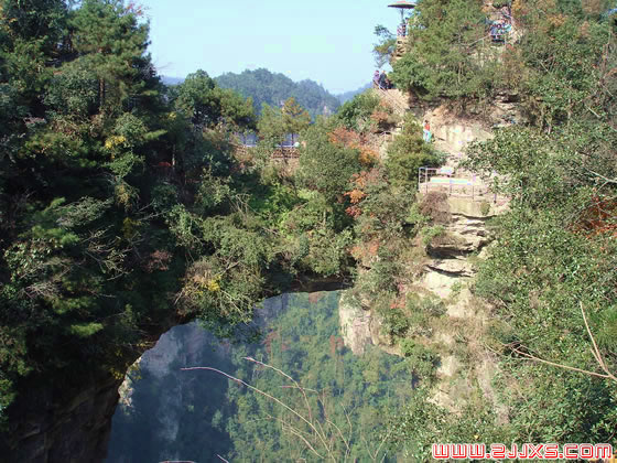 一天然石橋,位于張家界袁家界景區(qū),處砂刀溝風(fēng)景區(qū)一帶,屬?gòu)埣医缇A景點(diǎn)。大自然的鬼斧神工,將一塊厚約5米的天然石板,橫空“架”在兩座山峰之上,把東西兩峰連接。橋高350米,是張家界最高的石橋。高度、跨度和驚險(xiǎn)均為天下罕見,故稱“天下第一橋”。橋長(zhǎng)20米,寬僅1.5至3米不等,但較平坦,可通行人。橋上蒼松挺拔,橋下云霧蕩漾,萬(wàn)丈深淵。四周懸崖絕壁,水滴飛濺。踏上橋面,使人有凌空御風(fēng)之感。手扶鐵欄桿,仰視,青峰飄渺于云靄繚繞之中;俯瞰,奇峰如筍群,巖壑深谷中陣陣煙嵐泛起,散而復(fù)聚。此景點(diǎn)名稱出于八十年代中到此游覽的一位美國(guó)旅行家之口。