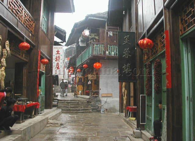 溪洲銅柱現(xiàn)存于芙蓉鎮(zhèn)民俗風(fēng)光館內(nèi)。公元940年,楚王馬希范與溪州刺使彭士愁多年交戰(zhàn)媾和,締結(jié)盟約,劃疆而冶,鑄5000斤銅柱為證。據(jù)史截:“后晉天福四年(公元939),溪州刺史彭士愁與當(dāng)時(shí)占據(jù)湖南的楚王馬希范發(fā)生溪州之戰(zhàn)。彭士愁戰(zhàn)敗后于后晉天福五年(公元940年)與馬希范議和,把戰(zhàn)爭(zhēng)的經(jīng)過和議和的條款,鐫刻于銅柱之上。銅柱重五千斤,高丈二尺,入土六心,形為八面,中空,內(nèi)實(shí)鉅錢,柱端覆蓋銅頂,銘誓狀于銅柱之上,立于會(huì)溪,宋天禧二年(公元1018年)重立時(shí),又羼刻了一些土官銜名。清中葉,柱上銅頂被盜,沉于江心,柱內(nèi)銅錢亦被人以飴粘錢殆盡。清光緒十一年(公元1885年),永順府知府張?jiān)鴵P(yáng)建亭保護(hù)。民國年間亭被毀!便~柱的銅質(zhì),精純光潤;八面所鐫顏、柳體陰文,雖經(jīng)千載風(fēng)雨洗刷,霜雪蝕磨,仍清晰如初。溪州銅柱是研究土家族古代歷史的重要文獻(xiàn)。土家族視銅柱為神物。   古鎮(zhèn)石板街遠(yuǎn)遠(yuǎn)望去,總感覺芙蓉鎮(zhèn)五里青石板街就像一本線裝古籍的書脊,書頁被上蒼之手打開,靜謐而又穩(wěn)重地?cái)傇谟纤舆,那書頁上凌空的吊腳樓和發(fā)生在樓里樓外的悲歡離合便隨歲月而動(dòng),演繹出許多鏗鏘溫馨、跌宕起伏的故事來……   湘西芙蓉鎮(zhèn)這個(gè)看上去普普通通的村落,原來是秦漢時(shí)土王的王都,古稱酉陽,五代十國時(shí)稱溪州。后因電影《芙蓉鎮(zhèn)》在此拍攝,于是人們便把此地叫做芙蓉鎮(zhèn)。   史書記載“位酉水北面,是酉水的重要碼頭,通川黔、達(dá)鄂瀘,舟楫之便,得天獨(dú)厚”。   從碼頭開始綿亙而上的石階,那是一條長達(dá)五里貫穿古鎮(zhèn)的青石板路,它沒有名字,于是人們就直接管它叫五里長街。踏上古街,似乎踩在被悠長歲月遺落的碎片上面。不知不覺走到掛有“土家觀瀑吊腳樓”牌匾的民俗博物館前,從手搖腳踏的棉花機(jī)、閹豬鳴號(hào)的羊角到世代相傳的雕花牙床,近百件散發(fā)著鄉(xiāng)土氣息的民間用具,展示著土家族古老豐富的歷史?醋o(hù)人說,這是一位土家族年輕人爬山涉水收集來的,靜靜地訴說著這個(gè)小村古老的過去。這棟三層的小樓,一半落在河岸上,另一半?yún)s是由水泥柱支撐著,水泥柱直插河底,任水流日日夜夜地沖刷,小小的吊腳樓仍穩(wěn)穩(wěn)當(dāng)當(dāng)站在那里,任憑時(shí)間的流逝。好聰明的土家人,巧借一片水面,竟建起了如此妖嬈的住房。   拾級(jí)而上,山路一般的陡峭。兩旁的青瓦木房鱗次櫛比,順山勢(shì)而錯(cuò)落有致。幾家織錦商店已經(jīng)開門,說是商店,不如叫作坊更確切些,因?yàn)榈昀锏闹饕娣e,都為織錦機(jī)所占領(lǐng),色彩斑斕的挎包、壁掛、床上用品等都掛在墻上,游客不僅可以駐足欣賞姑娘們的手和梭子在織錦機(jī)上飛動(dòng)的瀟灑,還可以慢慢觀賞陳列品的藝術(shù)特色。據(jù)說,當(dāng)?shù)氐墓媚镌瓉碇唤o親人和情郎穿針引線,如今卻生產(chǎn)出異彩紛呈的土家織錦來賣給陌生人,從情感所系的“非賣品”到只有技巧表現(xiàn)的商品,這種生活方式和情感上的跨越,仿佛不過是一夜之間的事。   有趣的是,米豆腐沿街都是,每一家都掛出電影《芙蓉鎮(zhèn)》的劇照,以示自己的正宗。其實(shí)在電影拍攝之前,米豆腐就早已是這里的特色,為什么要依賴那一個(gè)虛構(gòu)的故事呢?20年前,一部電影把“深居閨閣人未識(shí)”的這個(gè)小小村鎮(zhèn),從地圖上尋找出來,放在世人面前,然后將影響這里的多少代人,甚至深入到他們的骨髓。從那以后,曾經(jīng)與世隔絕的寧靜被打破了,而這種深刻的影響,大概就是從一碗米豆腐開始。   傍晚還剛剛來臨,長街上的小吃店就紛紛亮起昏暗燈光。這些家庭式小店,全都是當(dāng)?shù)厝藦淖约杭曳殖鲆粔K地方來順帶做的。鮮甜的桂花魚,以及肥美的“天下第一螺”,和米豆腐一樣,成為那里最難忘的美味。在村子里一座貞節(jié)牌坊旁,又發(fā)現(xiàn)清心透涼的另一種美味———冰鎮(zhèn)土家自釀糯米酒。聰明能干的土家人,他們自給自足,自在悠閑地生活著,男人在外打漁,女人在家織布,世世代代,沉浸在自己的文化里面。